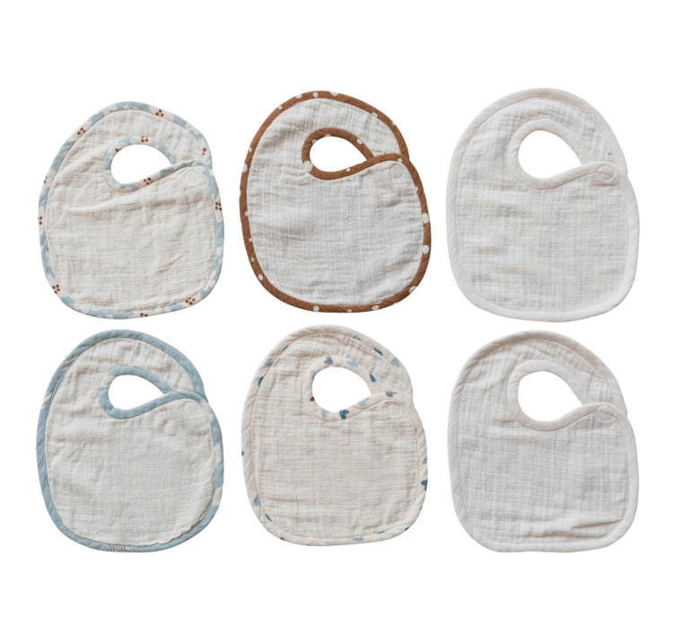 12"L x 10"W Cotton Double Cloth Printed Baby Bib w/ Pattern, 6 Styles