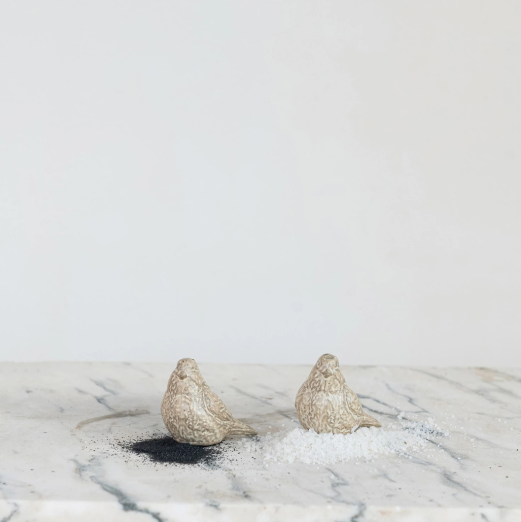2-3/4"L x 1-1/2"W x 2-1/4"H Debossed Stoneware Bird Salt & Pepper Shakers, Reactive Glaze, Tan Color, Set of 2