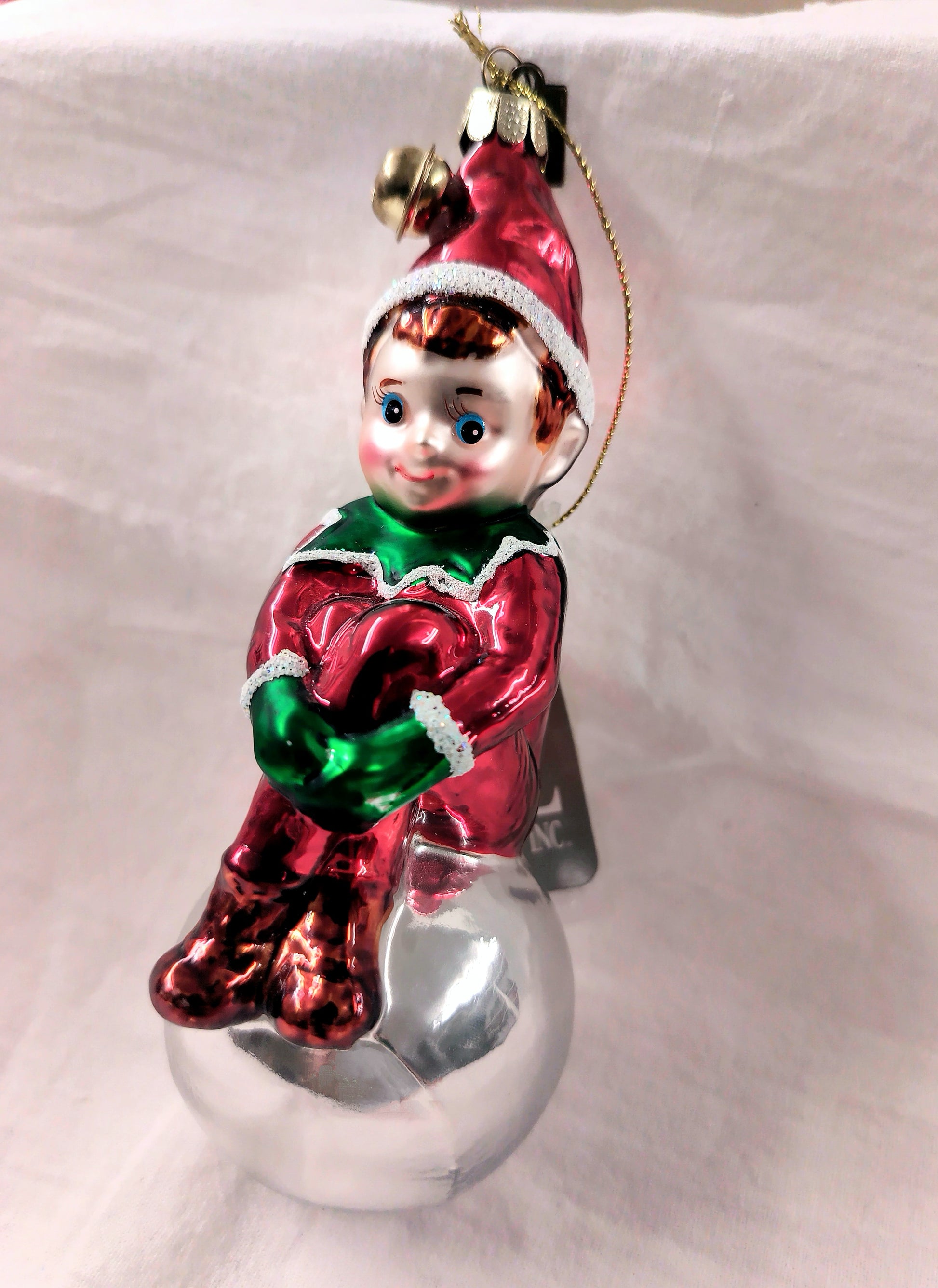 This glass ornament features a sweet elf sitting on an ornament ball! With it's super shiny finish, it's sure to add a sparkly pop of color to your holiday decorations! Approximately 5.25" tall