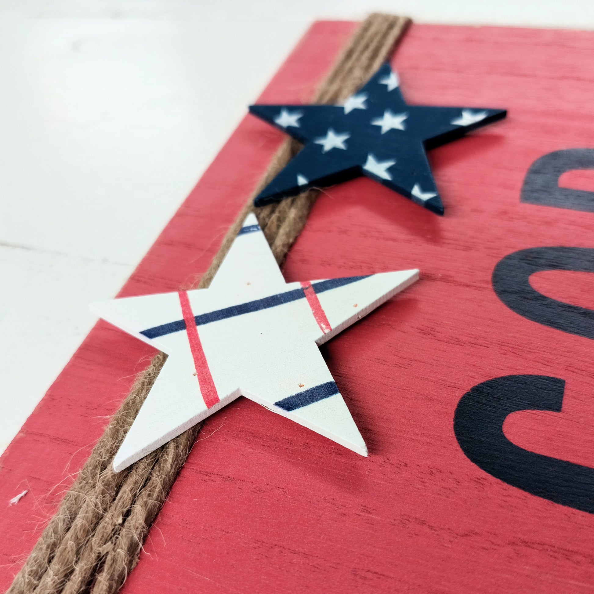 Wooden sign that reads "God Bless The USA" in navy blue and white text, decorated with navy blue stars.