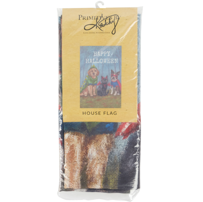 A double-sided polyester house flag displaying a charming scene of pets dressed in cute Halloween costumes with a seasonal sentiment that reads "Happy Halloween." Halloween pets design is replicated from original artwork painted onto burlap canvas, giving the art a unique depth and texture. Seasonal house flag is weather-resistant. Hand wash only.