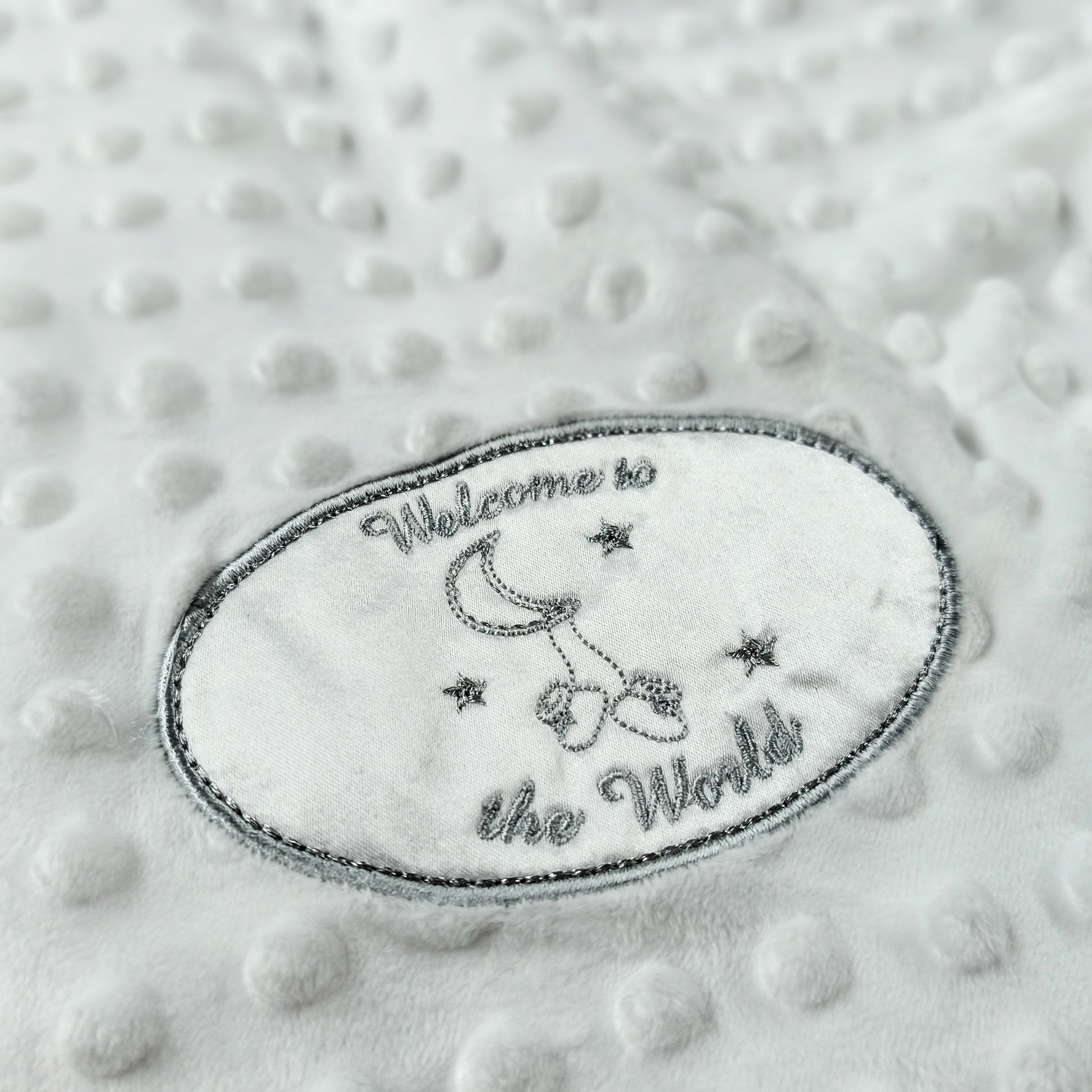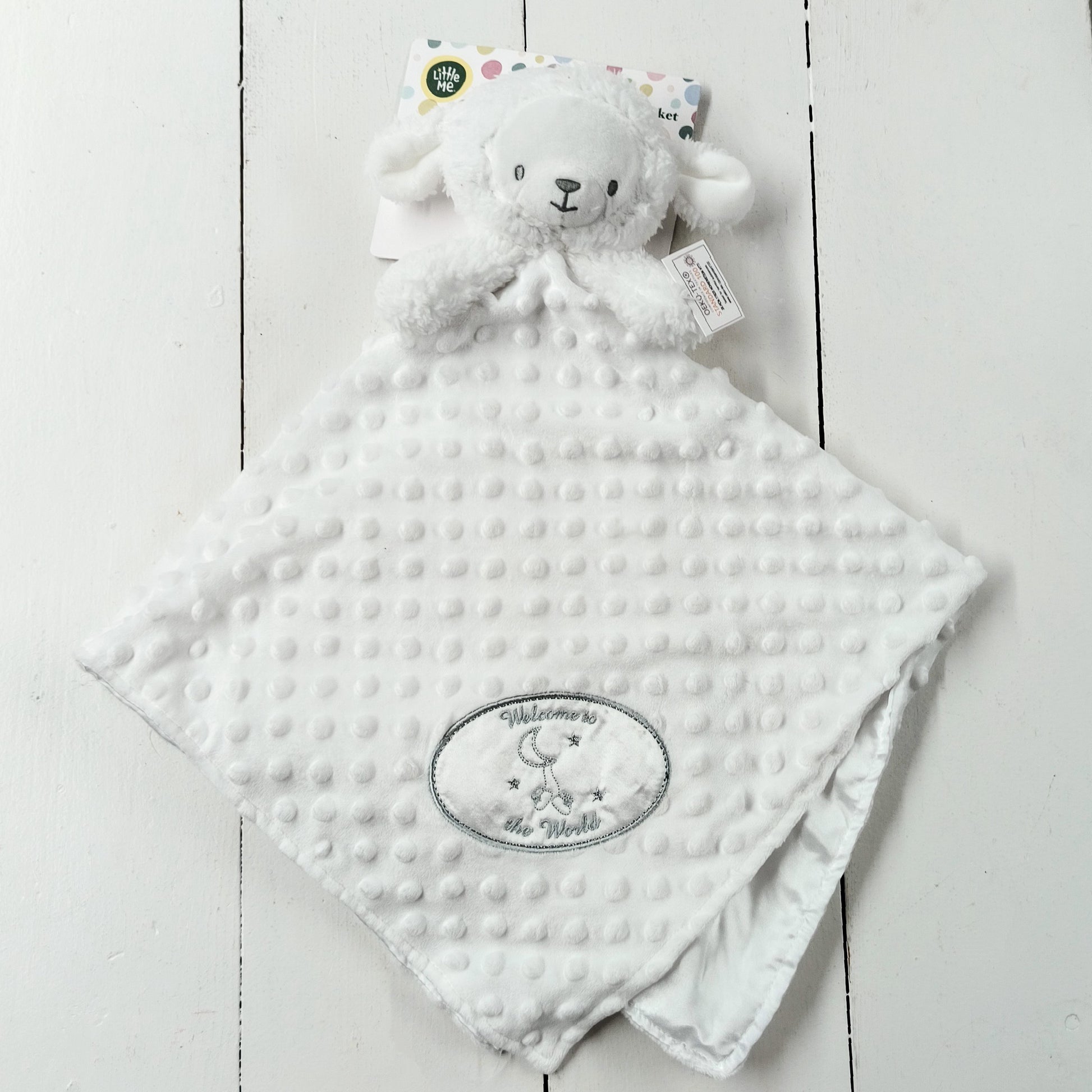 This plush snuggle blanket features a cute lamb and a textured, white material, with an embroidered patch that reads "Welcome to the world." Super soft and a perfect gift idea for any newborn that can become a security blanket as they grow!