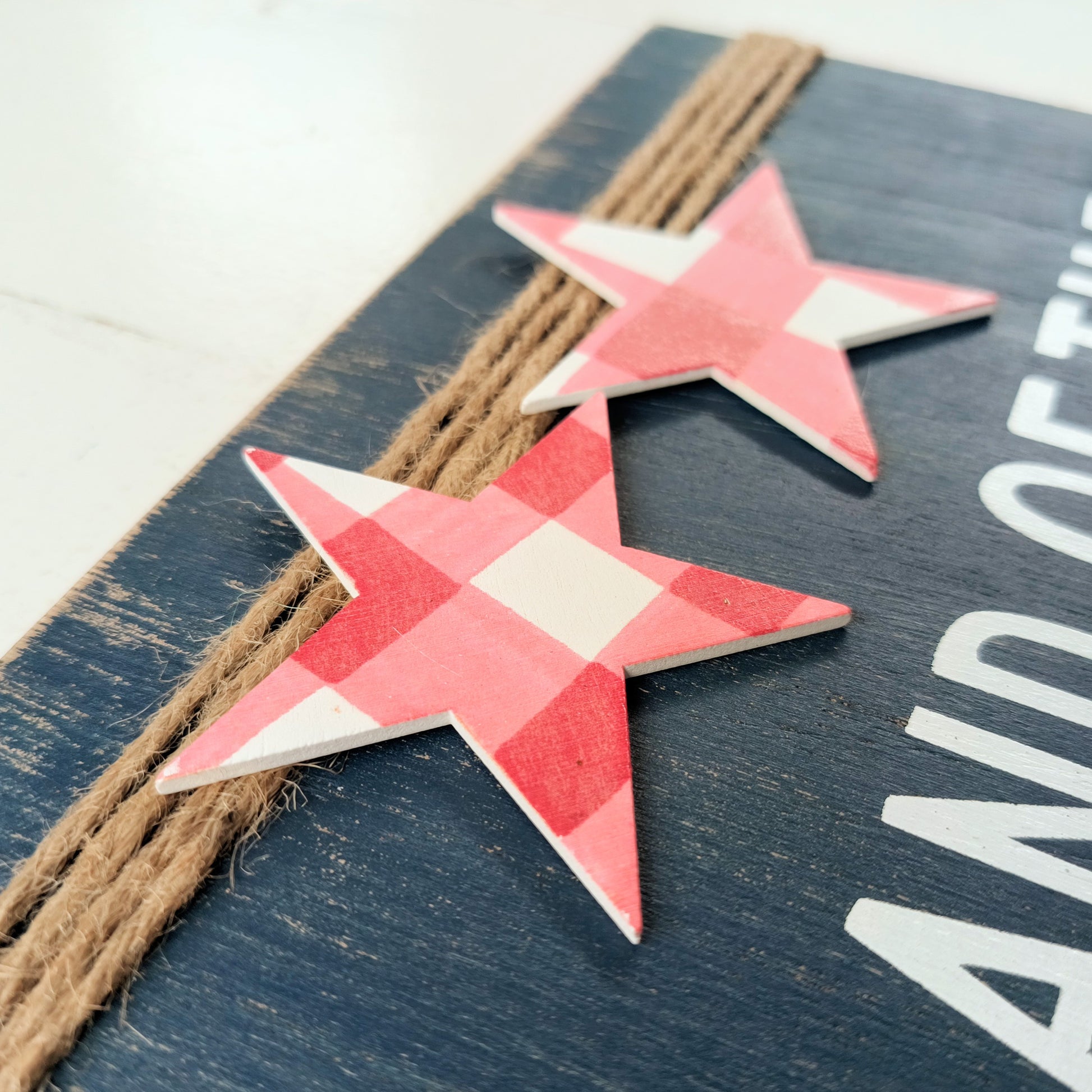 Wooden sign that reads "Land Of The Free Because Of The Brave" in white text, decorated with red and white gingham stars.