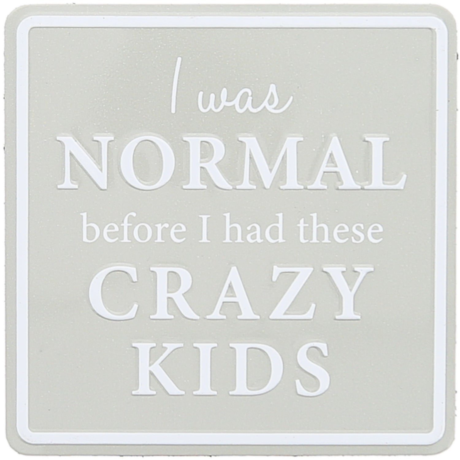 3.5" magnet has a securely attached tin front with rounded corners. These humorous designs are so relatable that you'll want them all! Stick them to your fridge to hang essential papers, kids' artwork, family photos, and more. The white embossed "I Was Normal Before I Had These Crazy Kids" sentiment and outside border make this simplistic design stand out on the solid gray background.