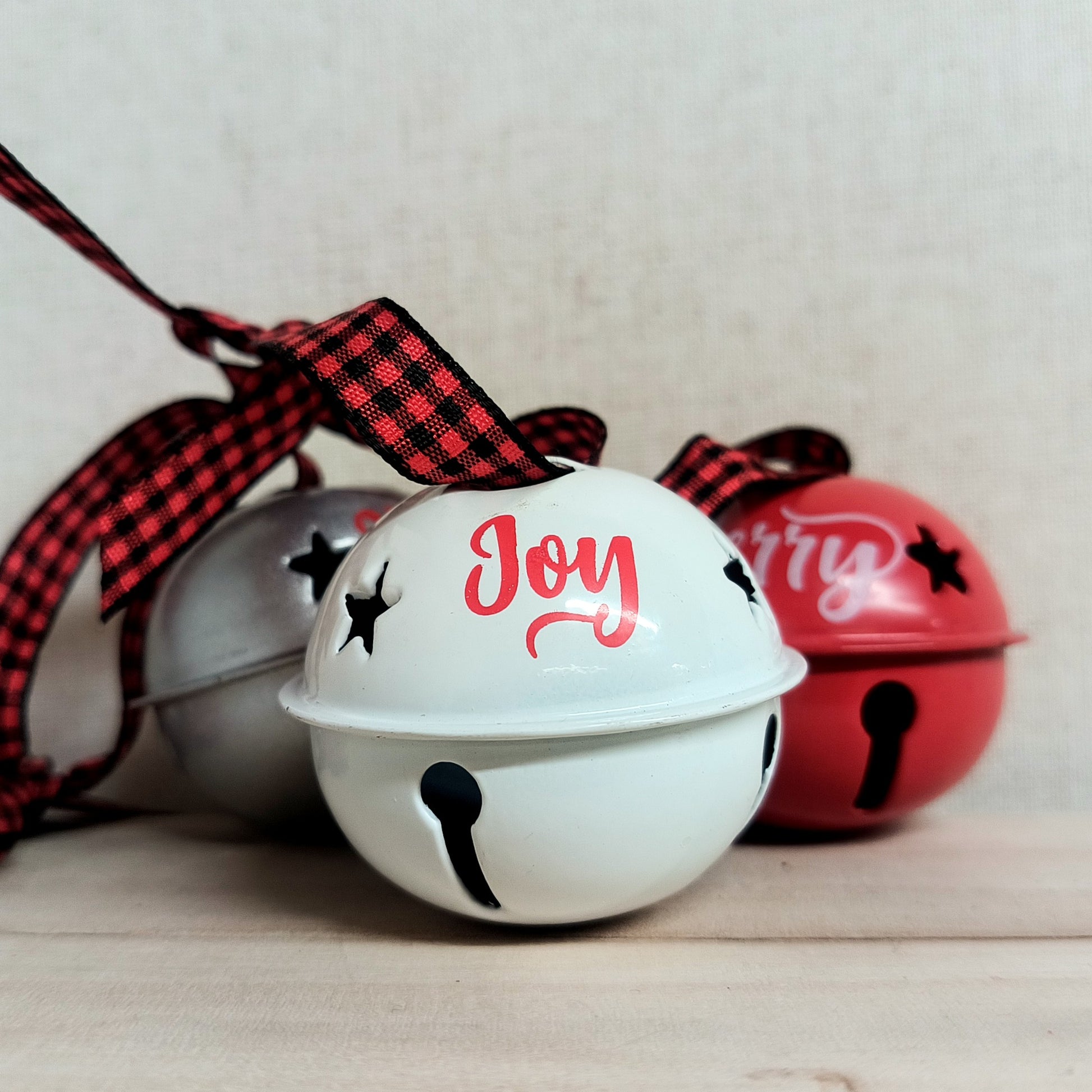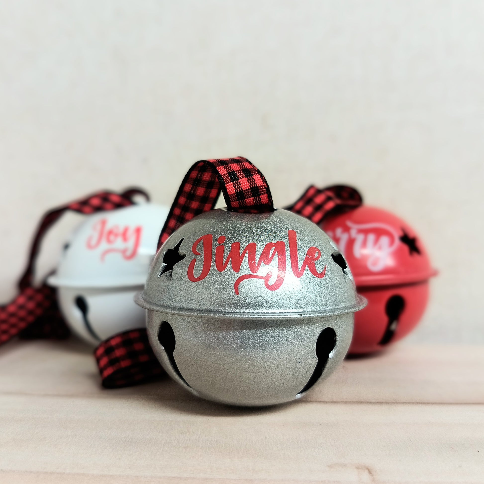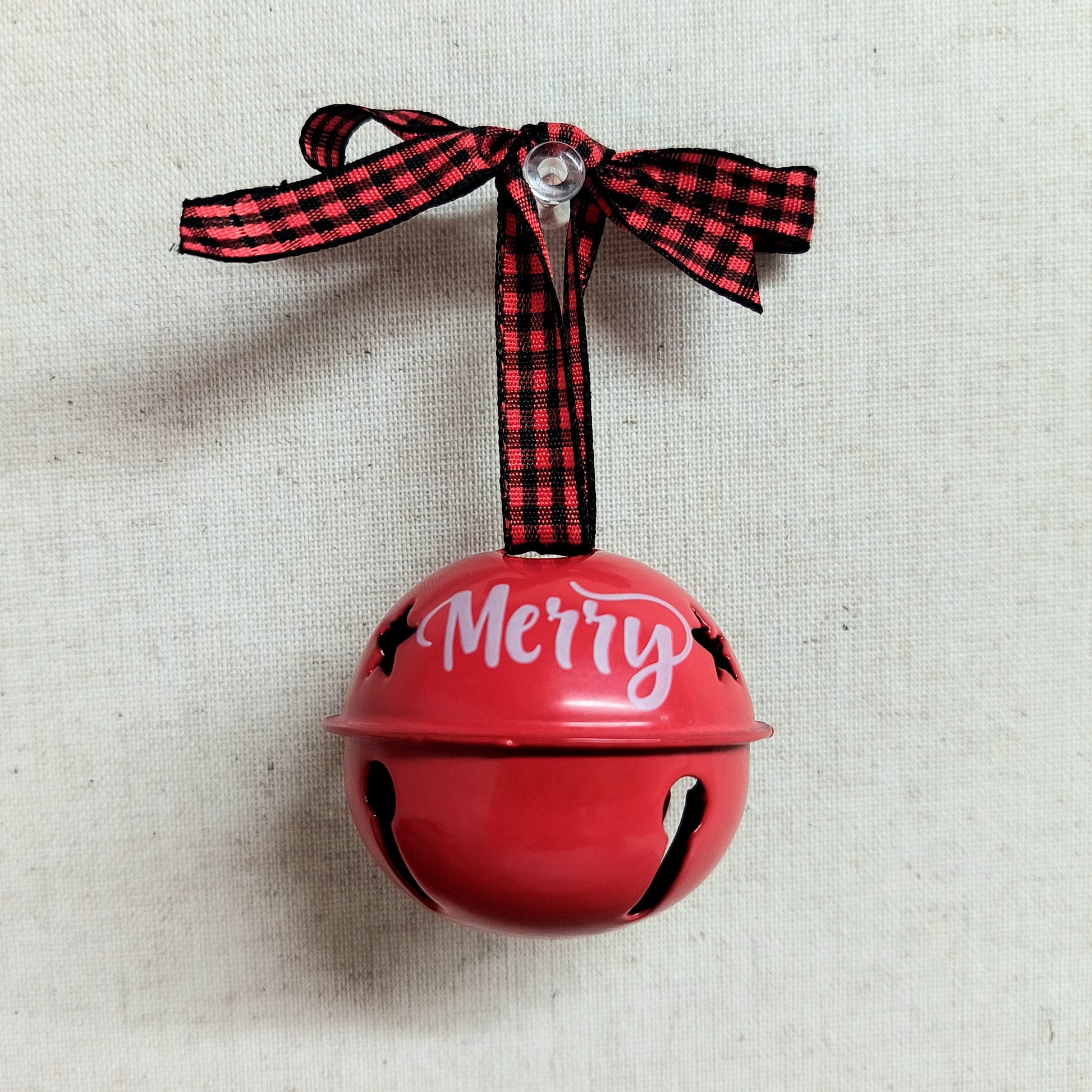 2" metal jingle bell with star shapes. Comes in 3 colors with the word Joy, Jingle, or Merry in a script font.