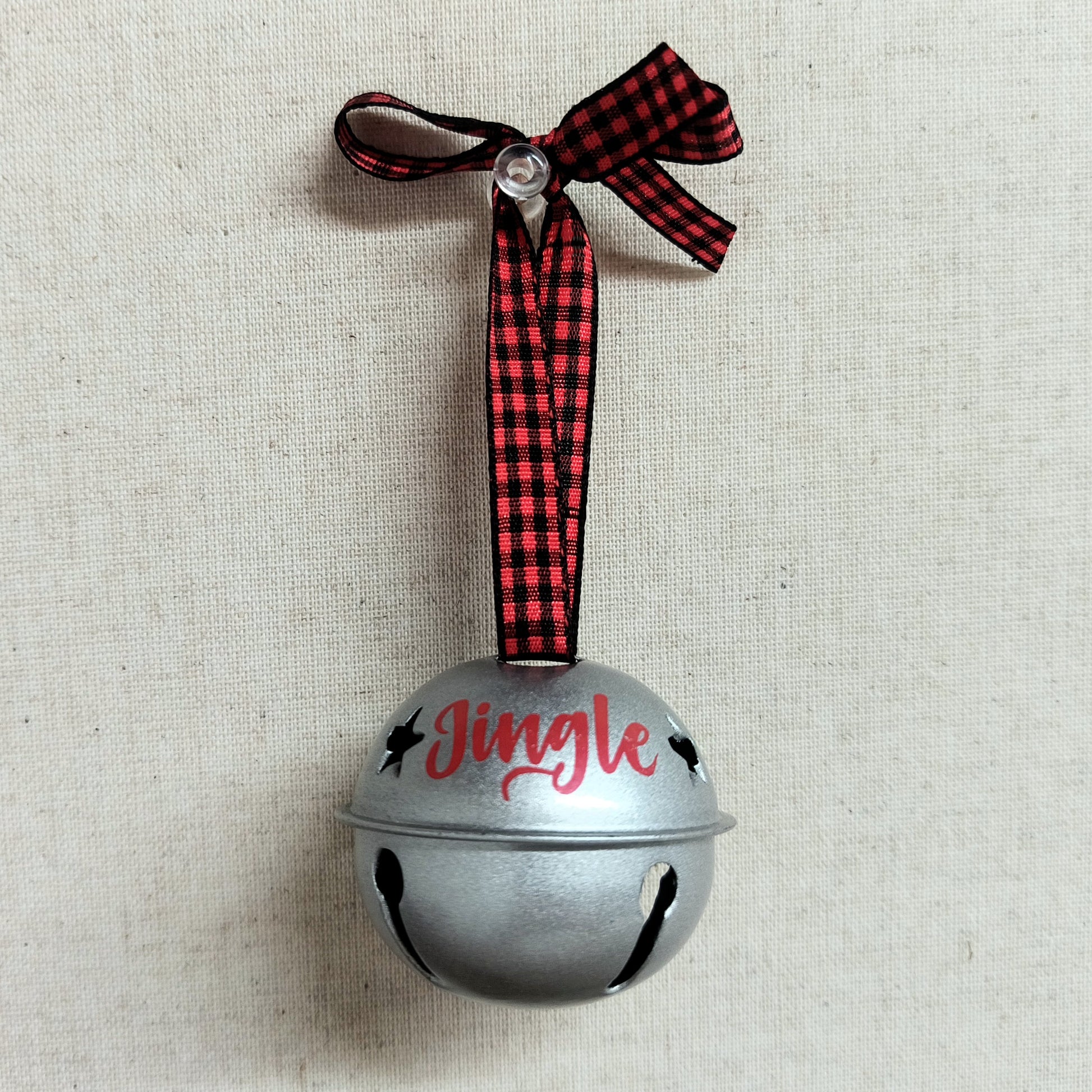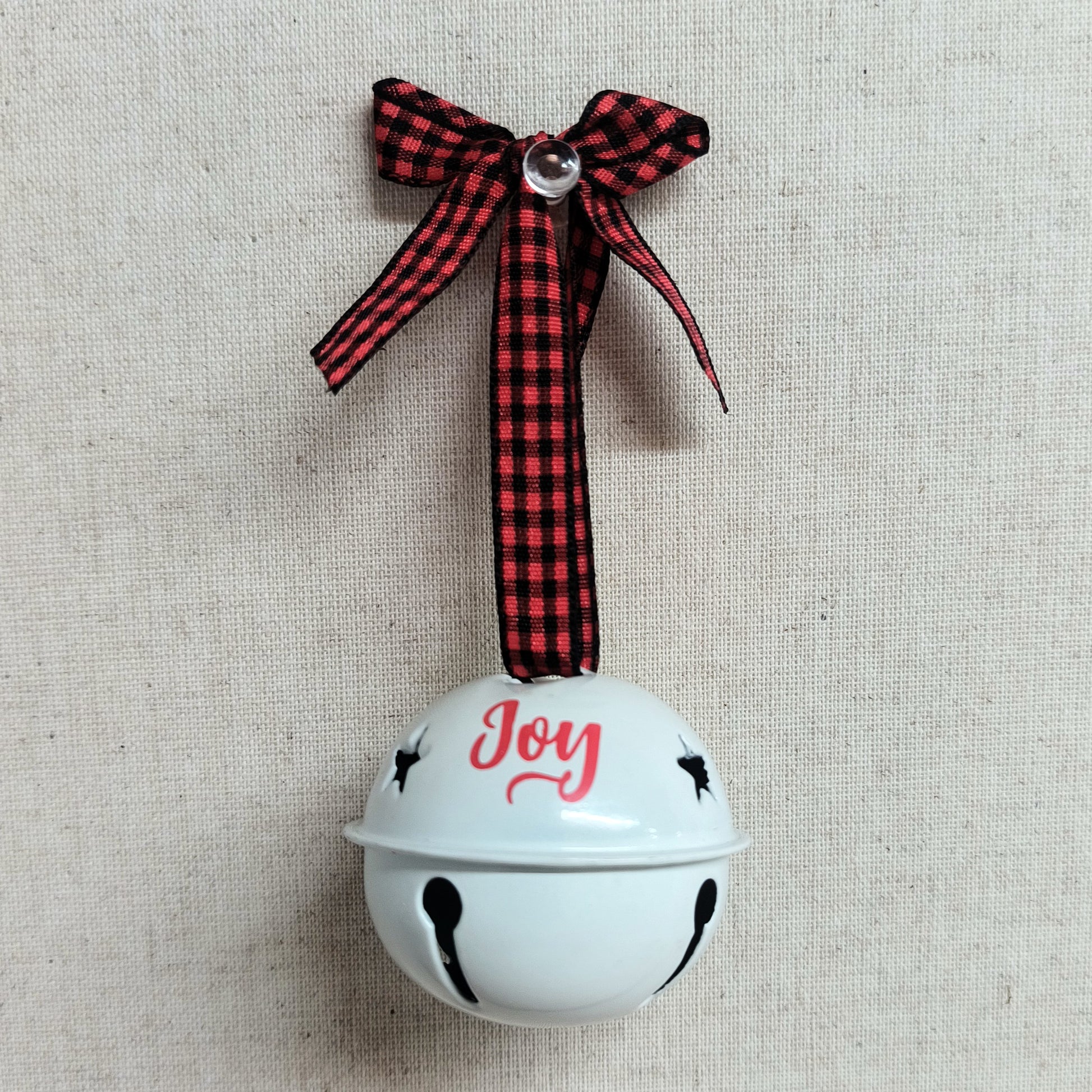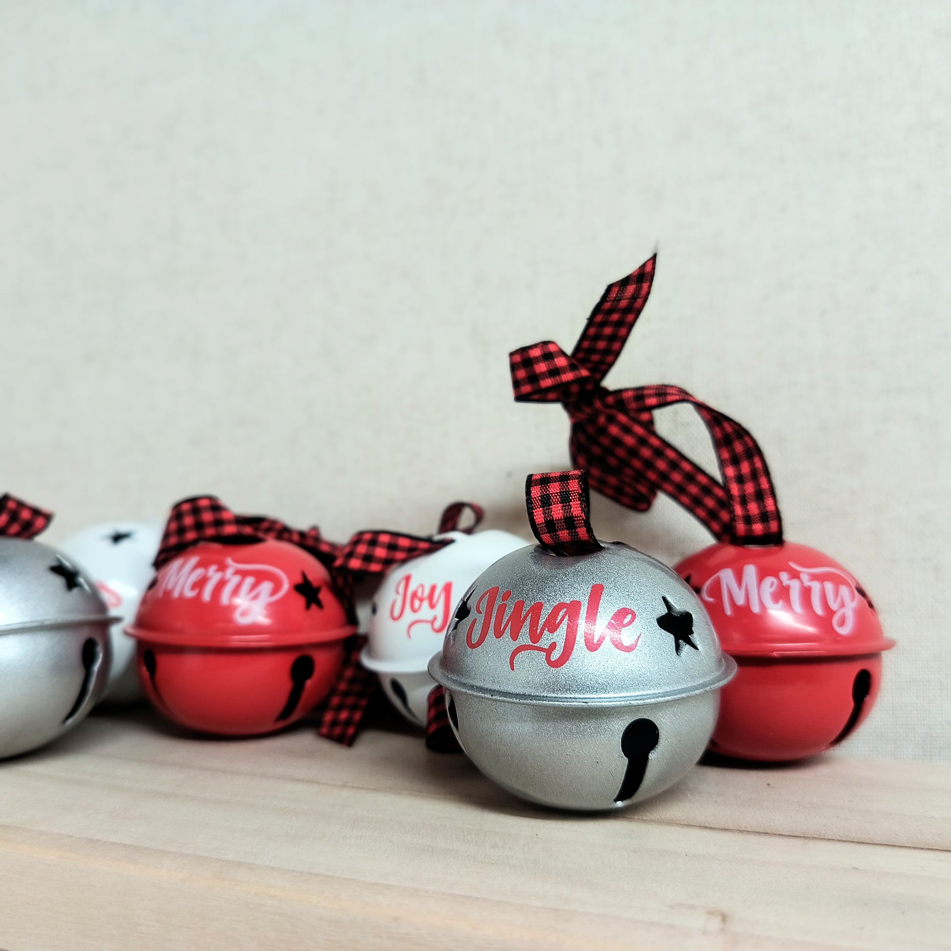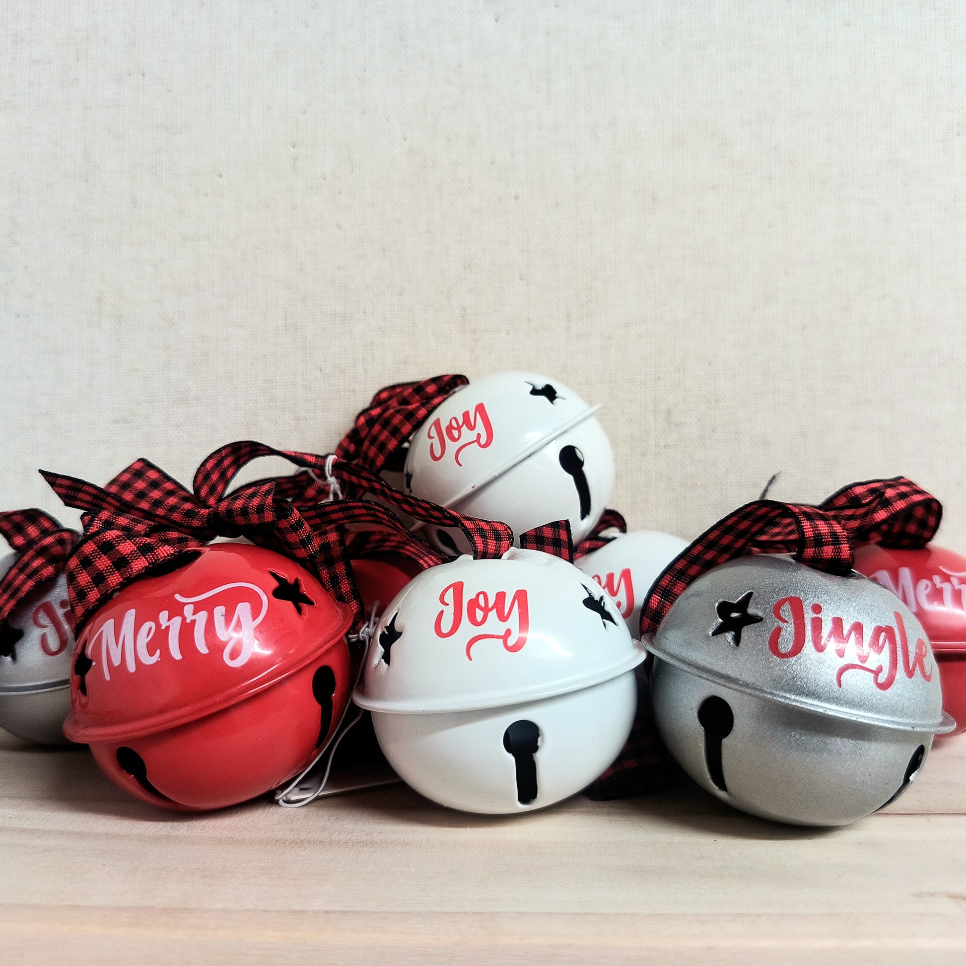 2" metal jingle bell with star shapes. Comes in 3 colors with the word Joy, Jingle, or Merry in a script font.
