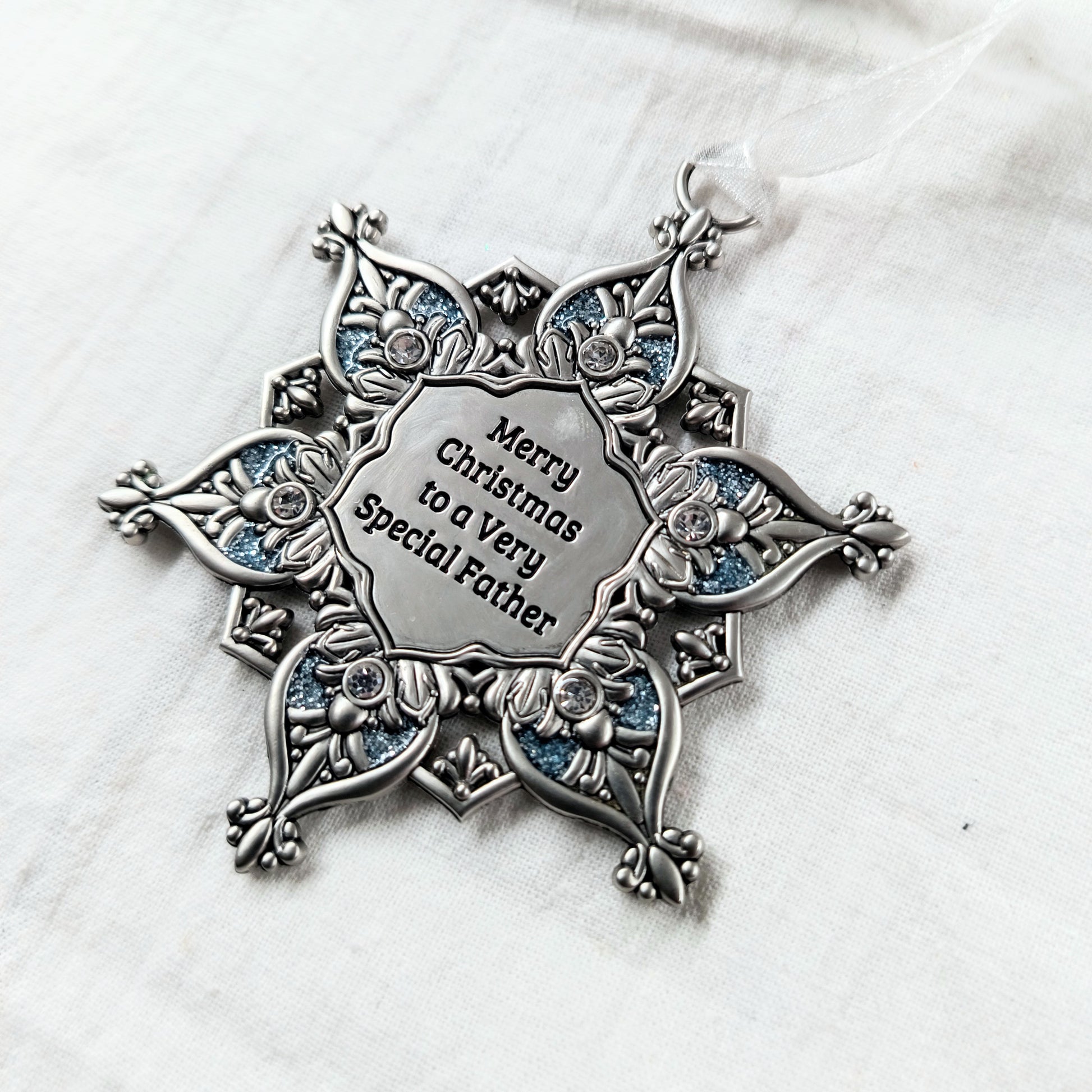 Metal ornament with subtle blue glitter and the text "Merry Christmas to a Very Special Father"