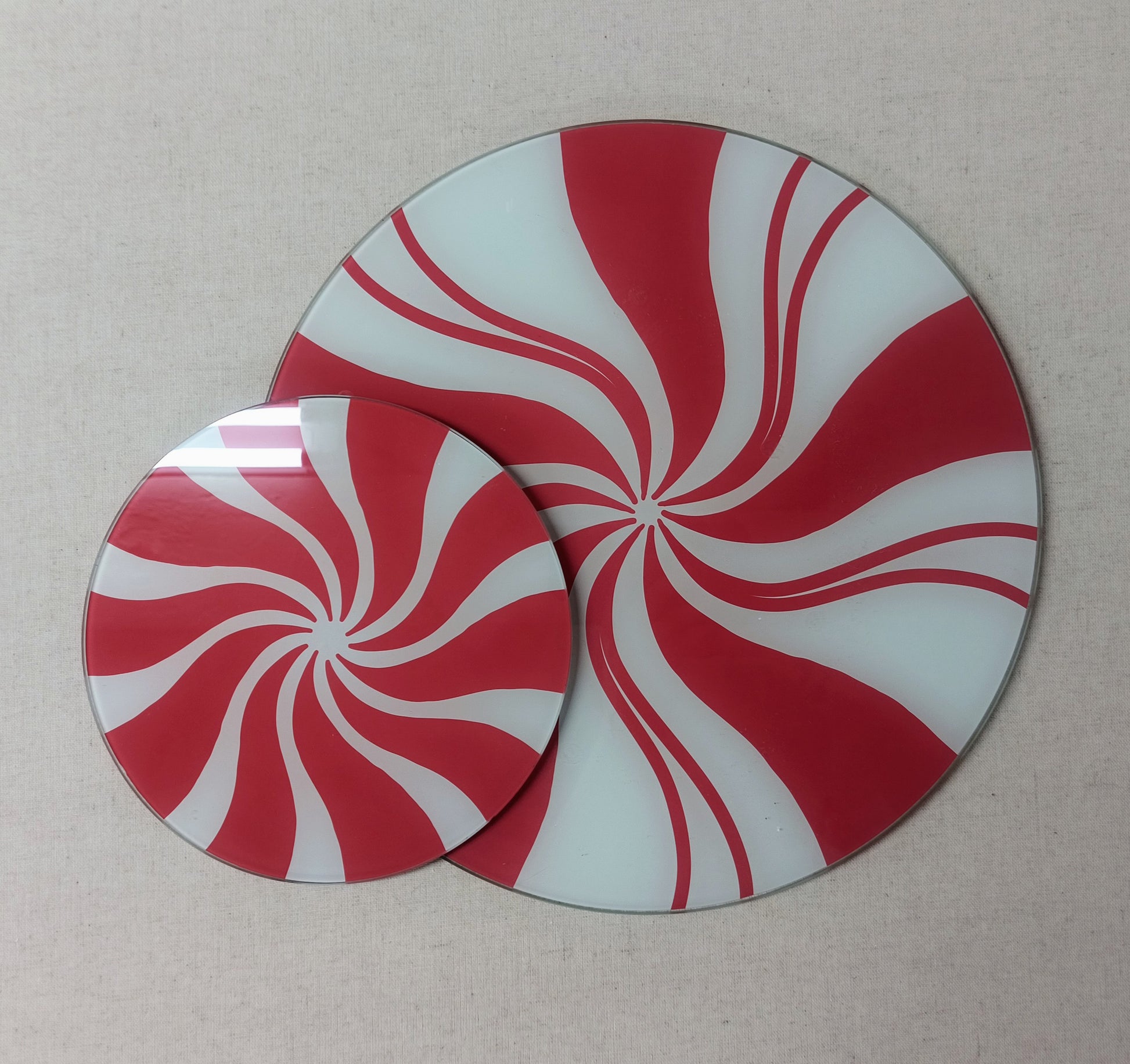 Set of two glass serving boards with peppermint design.