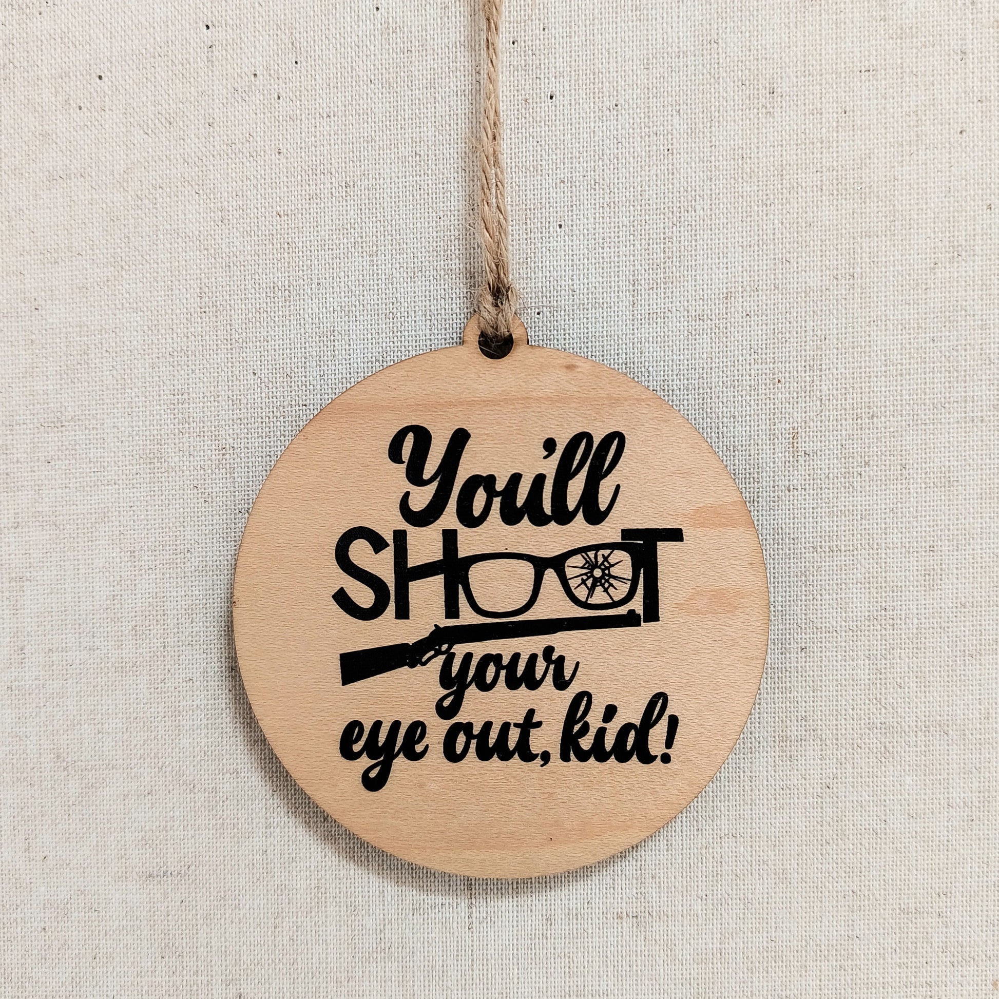 Wooden ornament that reads "You'll shoot your eye out, kid!"