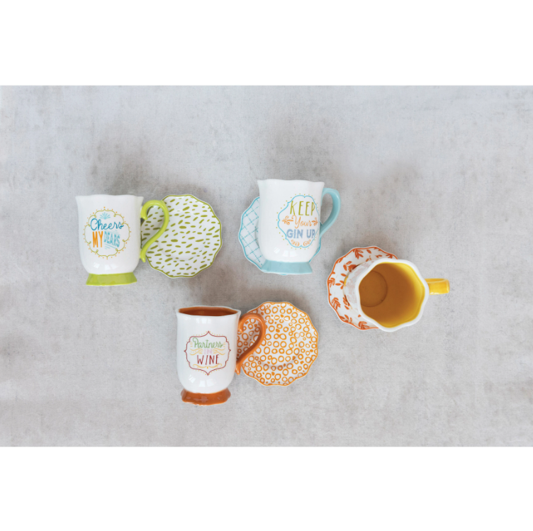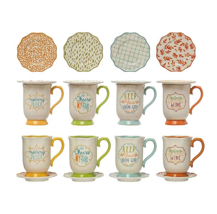 3-1/4" Round x 4-1/4"H 9 oz. Hand-Painted Stoneware Mug & Saucer w/ Saying